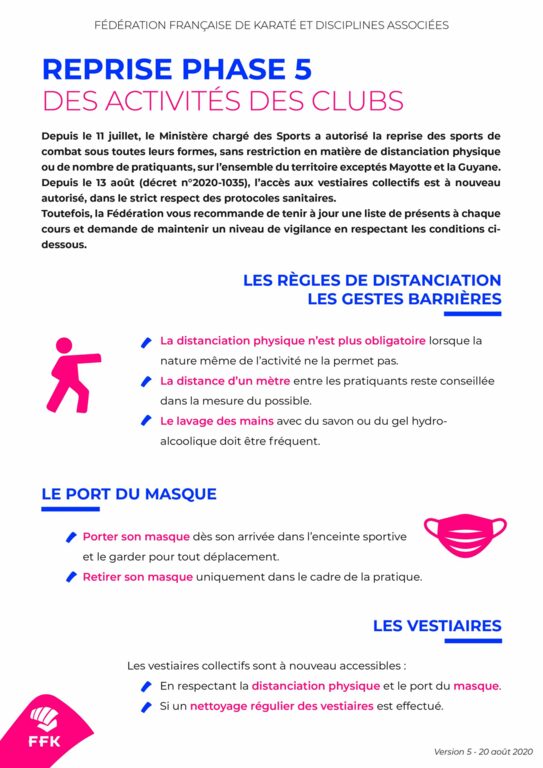 Après de longs mois sans pouvoir pratiquer notre sport, le lundi 07 Septembre 2020 les cours reprendront sans aucun changement aux niveaux des horaires. Nous appliquerons le protocole "COVID-19" mis en place par la fédération ainsi que par l'état, pour que les règles de sécurité à l’intérieur du dojo. Nous fournirons également du gel hydroalcoolique pour que chaque licencié puisse se désinfecter les mains avant et après les cours. Le masque sera obligatoire dans les vestiaires, couloirs et toilettes hormis sur les tatamis.